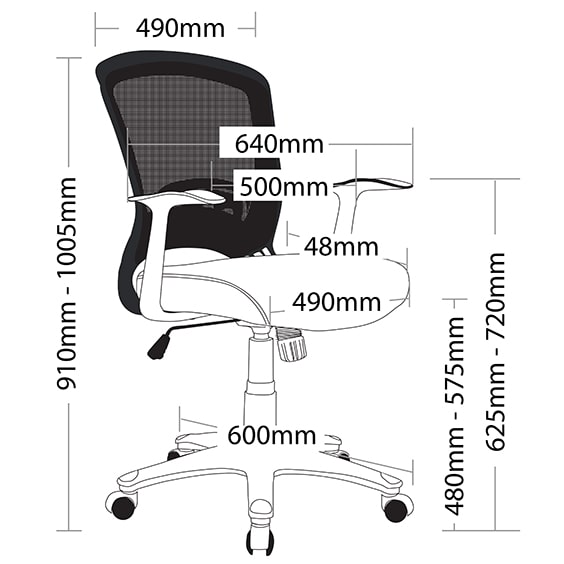 Adjustable seat height, Adjustable seat and back angle, Adjustable weight tension, Fixed arms, Butterfly mechanism, 600mm heavy duty 5 star base, Weight limit is 120kg.