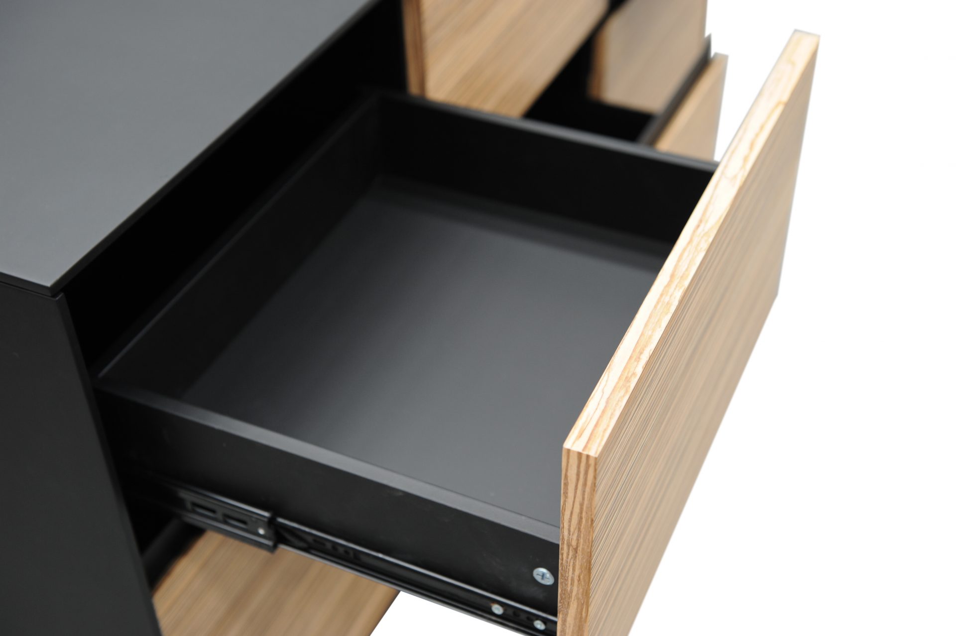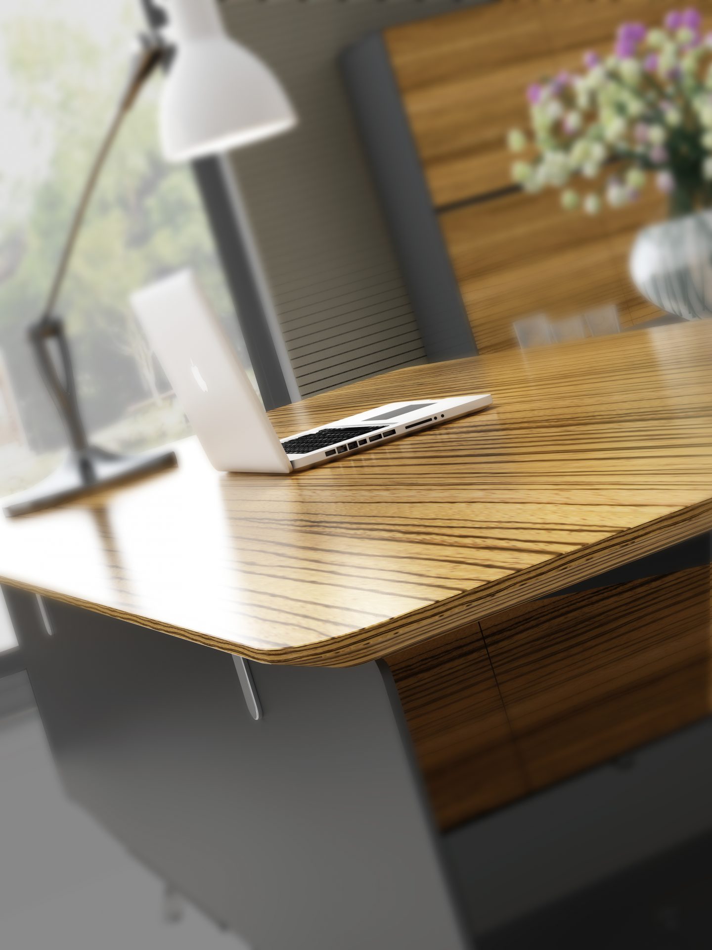 Zebrano Timber Veneer top with shark nose edging available in three sizes of 1950mm, 2150mm and 2350mm. Return on the Left or RIght based on sitting at the desk.